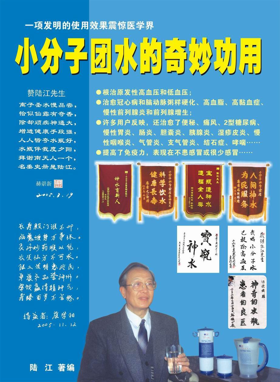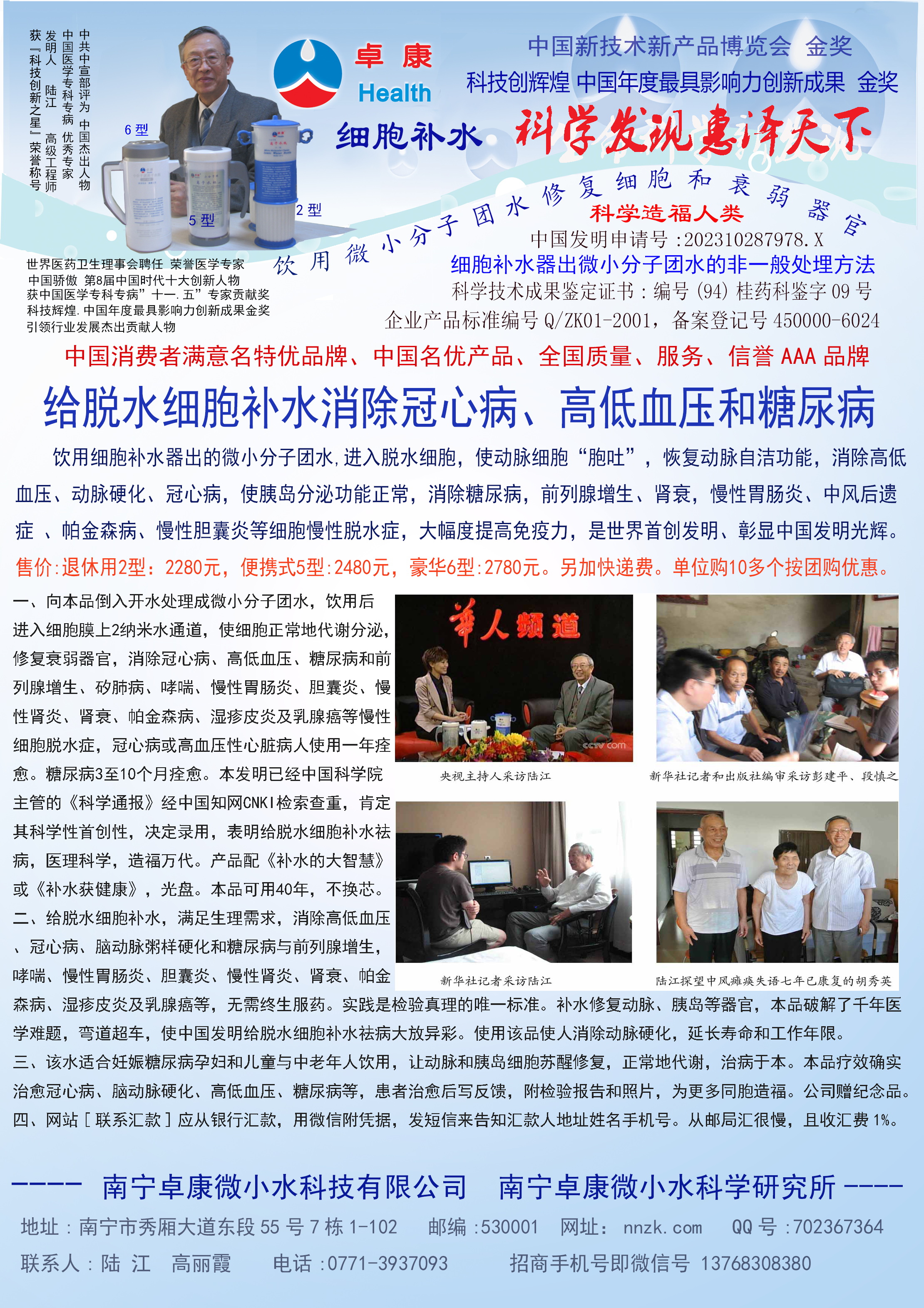 人類幾千年來患以上病癥需終生服藥,幾十年也不能治愈。可是我國南寧的高級工程師陸 江,于1990年想根治高血壓,研究發(fā)明了離子水瓶,處理出微小分子團水供飲用,經(jīng)過醫(yī)院臨床試用和專家鑒定,1999年獲中國發(fā)明專利權(quán),產(chǎn)品于2000年投放市場后一直跟蹤調(diào)查,據(jù)全國各地用戶反饋:祛除了高低血壓、糖尿病和冠心病,并使前列腺增生、咽喉炎、鼻竇炎、慢性氣管炎、支氣管炎、矽肺病、哮喘、慢性胃炎、腸炎、慢性膽囊炎、慢性腎炎、腎衰、膀胱炎、便秘、痔瘡、風濕性關節(jié)炎和濕疹皮炎及中風后遺癥等病癥不藥而愈。為什么喝微小水能治20多種病?陸 江從1991年德國科學家發(fā)現(xiàn)細胞膜水通道僅為2納米獲得啟發(fā),認為多種器官患病是因細胞脫水,不能正常代謝和分裂增殖,才使器官細胞減少致衰弱萎縮而形成細胞缺水性病癥。22年來的實踐有力地支持了“細胞脫水致病”這一重要論點,表明喝微小水可滿足細胞的生理需求,補水就能祛病,是生命科學新亮點。